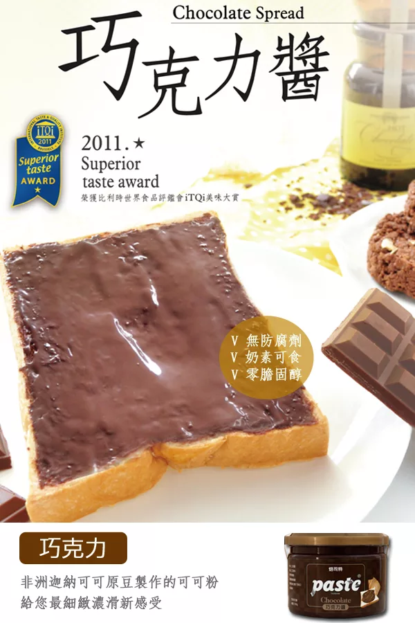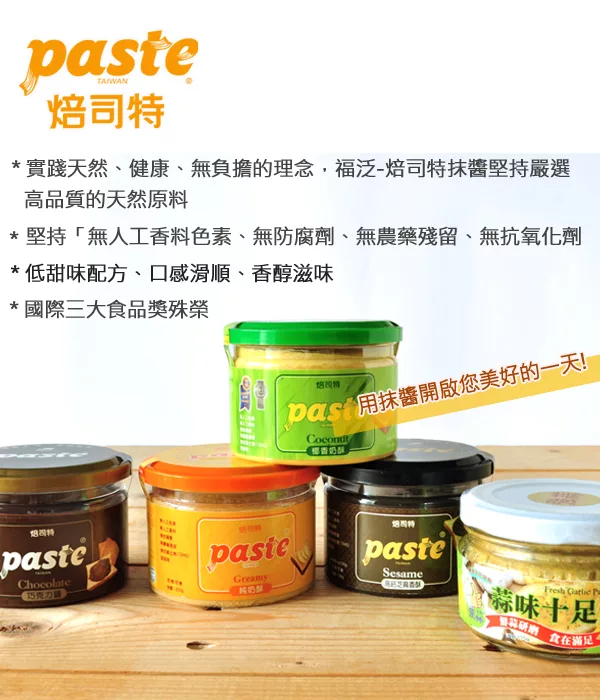 Paste焙司特-高品質外銷抹醬 守護您的每一天!製程講究健康,嚴選高品質的天然原料,「無人工香料、色素、無防腐劑、無農藥殘留、無抗氧化劑」。焙司特抹醬低甜味、